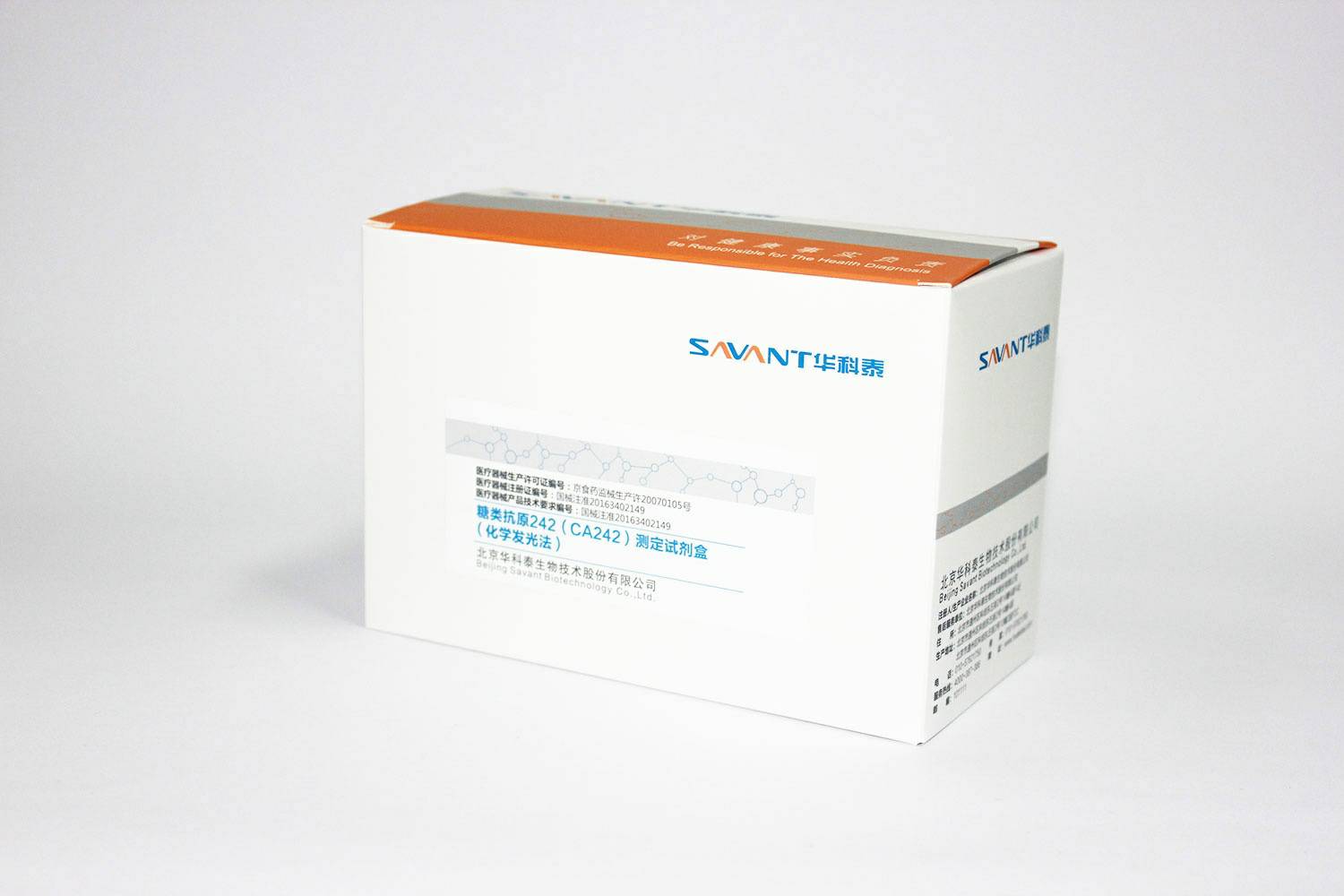 本试剂盒用于体外定量检测人血清中糖类抗原242(CA242)的含量。 CA242是一种唾液酸化的糖类抗原,能被CA242单克隆抗体识别。他是一种粘蛋白类型的糖蛋白,在健康人和良性疾病患者血清中含量很低,消化道发生恶性肿瘤时,通常血清CA242出现升高。如以17U/mL为阳性值,对胰腺癌、结、直肠癌分别有86.2%和62%的阳性检出率,正常人假阳性率为4%。该试剂主要用于胰腺癌、结、直肠癌的诊断与检测,对肺癌,乳腺癌等也有一定阳性检出率。